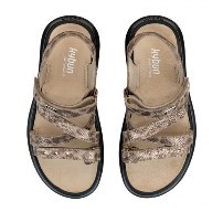 The women's sandal kybun Genf Bronze combines urbane style and trend simultaneously. You can wear it for an aperitif, for a stroll through the city or simply for leisure. The upper shoe of the Genf Bronze model appears in a leopard look and lives up to its name with the slight shine of its surface. The airy sandal can be adjusted individually to a woman's foot over the instep and on the forefoot.