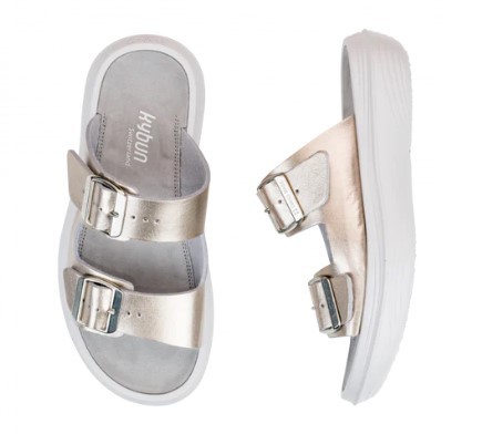 The popular slip-on now is now available in classic beige with a subtle shine on the upper shoe. Thanks to the two golden buckles, the comfortable and practical women's model can be perfectly adjusted to any instep height. kybun Glarus Tin is among other things perfectly suitable as a slipper, for all women who do not want to forego elegant and practical footwear.