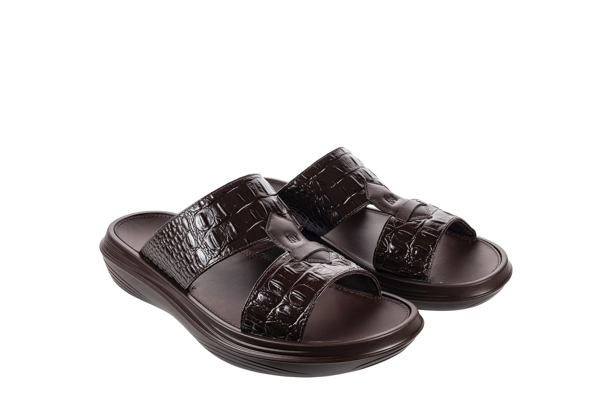 Gorgeous slide sandal, with sumptuous croco-embossed leather straps, and supple full-grain embossed front detail. A stylish yet classic look. Featured with the unique Swiss air-cushion sole, with higher rebound effect, that provides an exceptionally gentle walking sensation while relaxing the strain on the joints and the back, stimulating the health-promoting receptors in the feet and strengthening the muscles at every step.