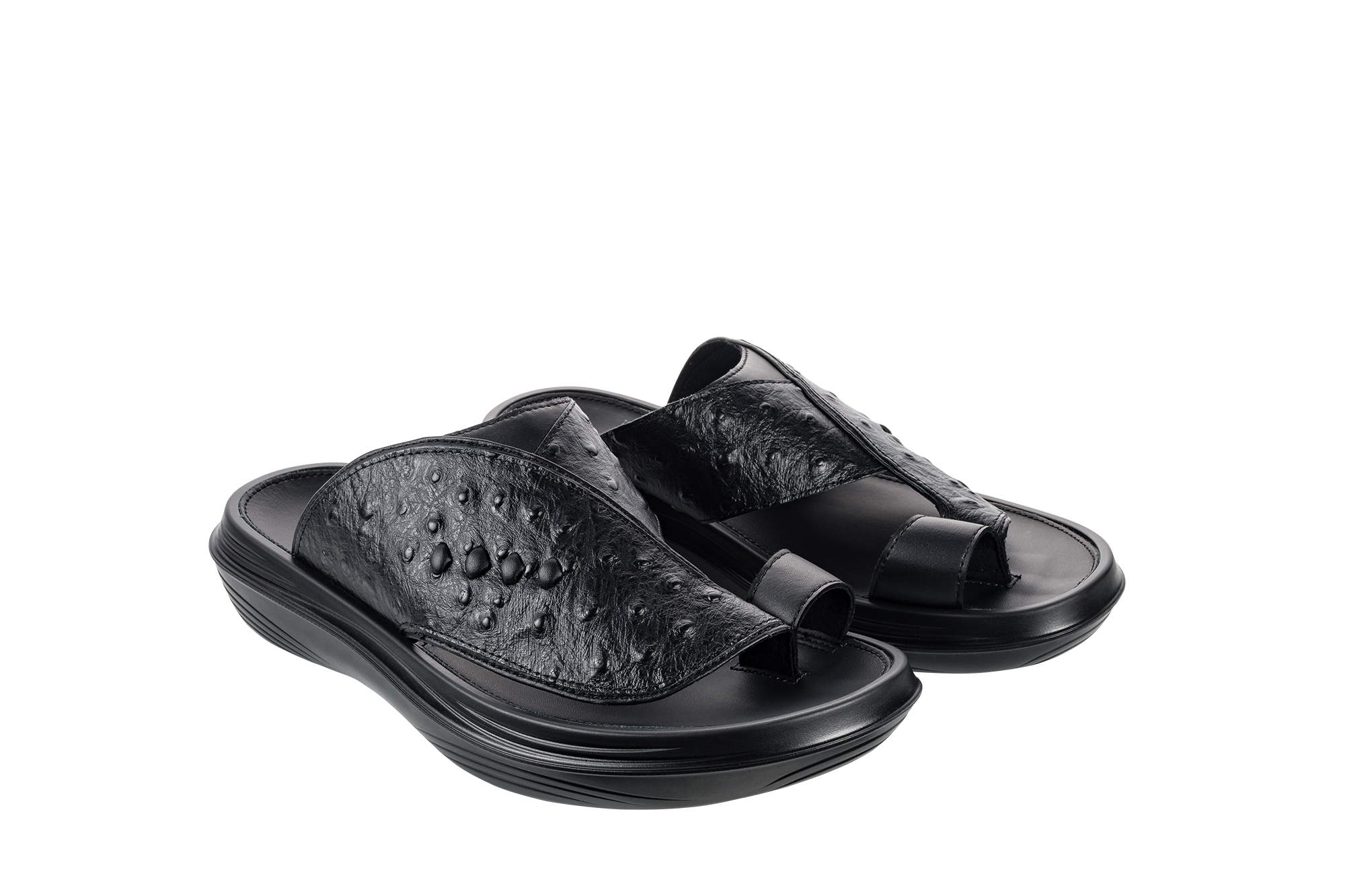 Delightful ostrich-embossed leather and soft full-grain leather toe-post sandal. Comfort and style in a timeless and versatile design. Ideally suited for everyday use, special events, or work. Featured with the unique Swiss air-cushion sole, with higher rebound effect, that provides an exceptionally gentle walking sensation while relaxing the strain on the joints and the back, stimulating the health-promoting receptors in the feet and strengthening the muscles at every step.
